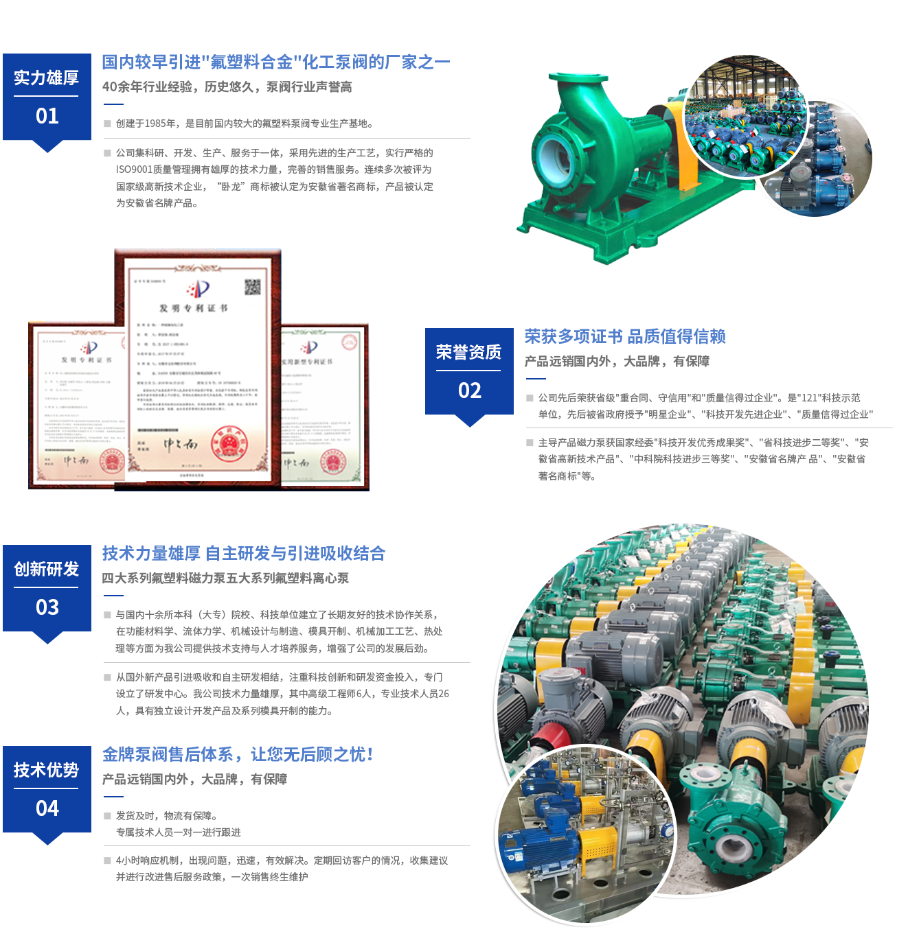??安徽臥龍泵閥股份有限公司前身涇縣氟塑料制品廠創建于1985年,是國內較早引進中科院上海有機化學研究所專利材料——"氟塑料合金",并以此耐腐蝕材料專業生產制造化工泵、閥、襯氟管道等產品的企業。公司經過歷次的改制變革,2015年更名為安徽臥龍泵閥股份有限公司。